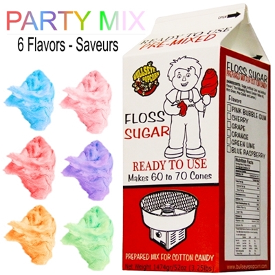 Don't just settle for any old cotton candy floss sugar. Insist on the cotton candy floss sugar that everyone has loved for years. Each ready-to-use carton contains enough cotton candy floss sugar to make 50 serving of 28.4 g (1 oz.) cotton candy cones. The floss sugar is sold in a variety of popular cotton candy flavours and colours.