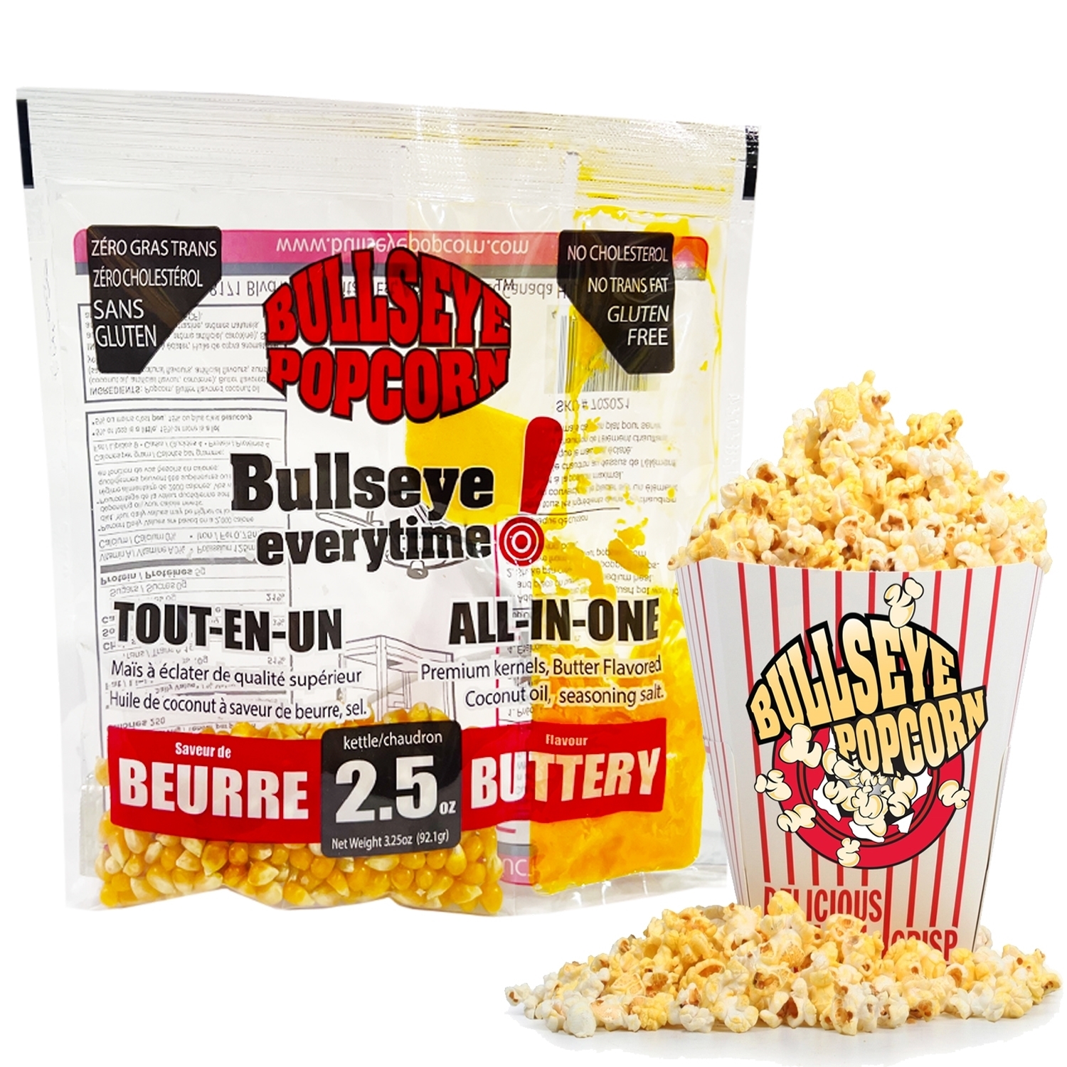 For over 15 years, Bullseye Popcorn has been delivering Canada’s finest popcorn, featuring an ultra-rich and savory buttery flavor. Now, you can enjoy that perfect movie theater taste at home with our Bullseye Popcorn Pre-Pack!